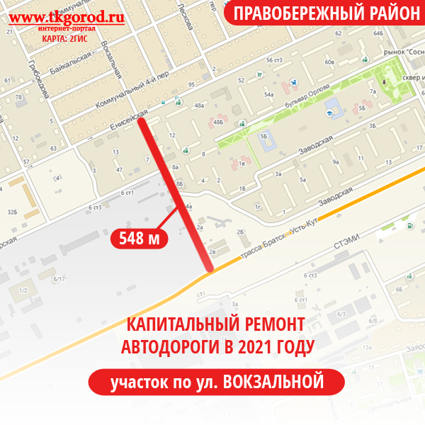 Капитальный ремонт участка автомобильной дороги по улице Вокзальной в Правобережном районе Братска должны начать в апреле этого года и закончить к ноябрю. Такие сроки обозначены в муниципальном контракте. Проект контракта и другая документация размещены на официальном сайте госзакупок.