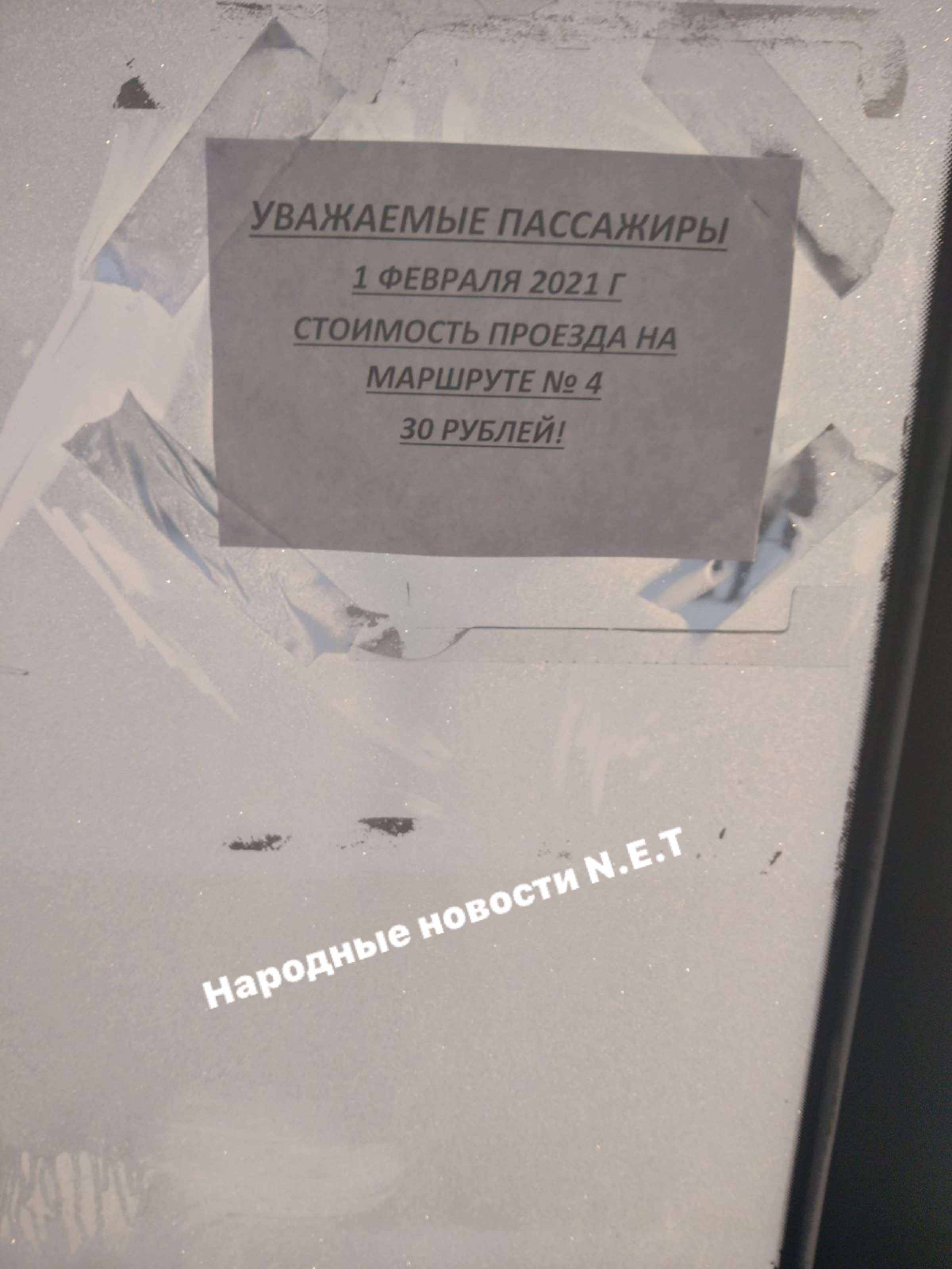 «Уважаемые пассажиры! 1 февраля 2021 г. стоимость проезда на маршруте №4 30 рублей», - гласит объявление.