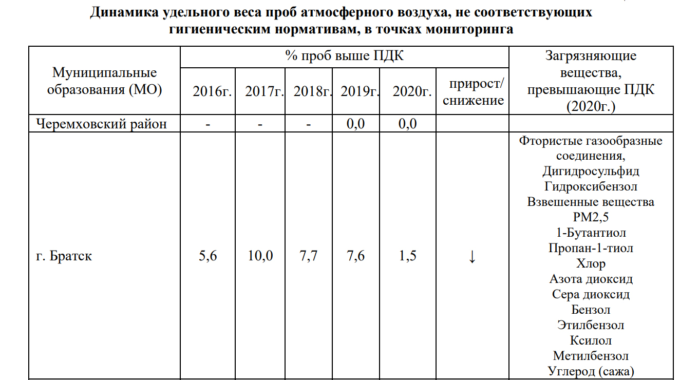 В госдокладе отмечается. что чаще регистрируется превышение ПДК загрязняющих веществ, характерных для алюминиевой промышленности. Поэтому Братск, наряду с Шелеховым, по данным Роспотребнадзора, на протяжении нескольких лет относятся к территориям «с наибольшей вероятностью развития негативных эффектов вследствие загрязнения атмосферного воздуха».