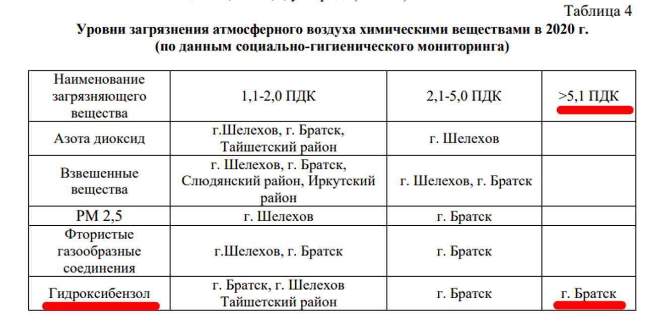 Кроме этого, в 2020 году в Братске было зафиксированное единственное в Иркутской области более чем пятикратное превышение предельно допустимой концентрации вредного вещества, а именно гидроксибензола (фенола). Это токсичное вещество второго класса опасности, которое негативно влияет на нервную систему человека.
