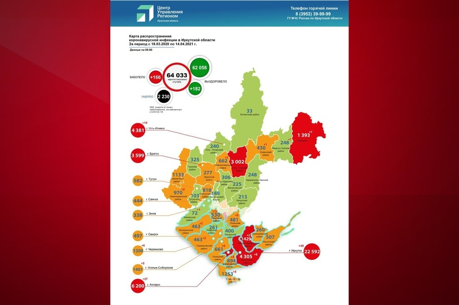 На утро 14-го апреля в Иркутской области зарегистрировано 64 033 случая инфицирования коронавирусом. Только за минувший день врачи поставили диагноз COVID-19 166 жителям региона.