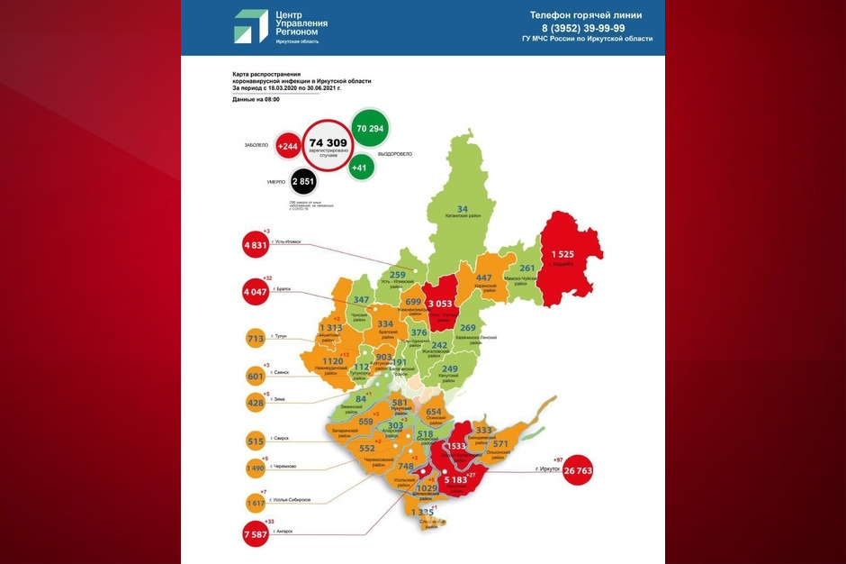 По данным на 30 июня в регионе зафиксировано 74 309 заболевших, включая 244 случая заболевания, выявленных накануне. Госпитализировано 4709 жителя области. За сутки в больницы региона доставлены 167 человек.